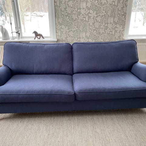 Sparsamt utnyttjad soffa, mörkblå, säljes. Modellen är Primrose och den köptes på Jotex dec 2020, pris då knappt 9000 kr. Skicket är gott, soffan är hel och ren med undantag för sidorna (se bild) där husdjuren klöst en del.