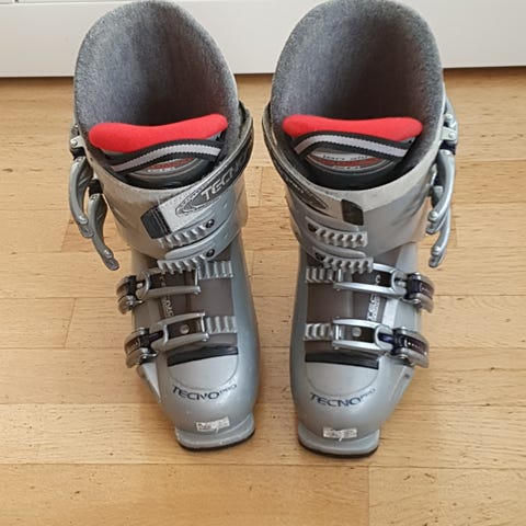 Tecno Pro Maxum 4.9 pjäxor i svart färg. Modellen har hårt yttre skal med flera justerbara spännen framtill och justeringsratt bak för anpassning av passform. Invändigt finns vadderat foder för komfort. Lämpliga för alpin skidåkning