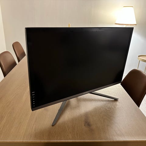 AOC C27G1 bildskärm med 27 tum skärmstorlek i svart utförande. Skärmen är lite välvd och står på ett justerbart stativ med tre ben. På baksidan finns anslutningar, bland annat HDMI enligt märkningen.