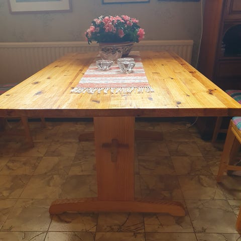 Bordsskivan är åttakantig med markerad kantlist i den satt tidigare en stenskiva nedsänkt i ca 1 cm kan fixas med att lägga i tex mosaik istället.