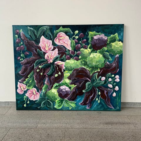 Tavla med abstrakt motiv i gröna och blå toner med röda konturer mot ljus bakgrund. Målningen är rektangulär och målad på duk uppspänd på kilram. Passar som väggdekoration i exempelvis vardagsrum, hall eller kontor. Skickas.