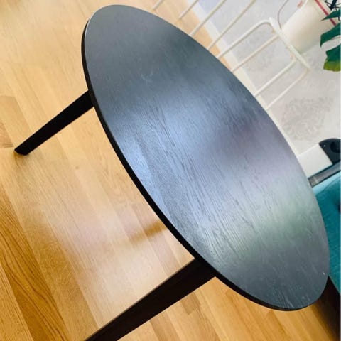 Mio soffbord runt i trä. Bordet har en rund bordsskiva och en underhylla för förvaring av till exempel tidningar eller böcker. Passar som soffbord i vardagsrum eller liknande utrymme.