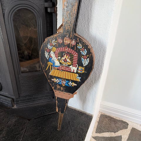Blåsbälg i koppar och trä med präglad hjärtdekor på framsidan. Utrustad med handtag upptill och munstycke nedtill. Passar som funktionellt redskap vid öppen spis eller som dekorativ inredningsdetalj på vägg. Mått 52 cm lång, 19 cm bred.