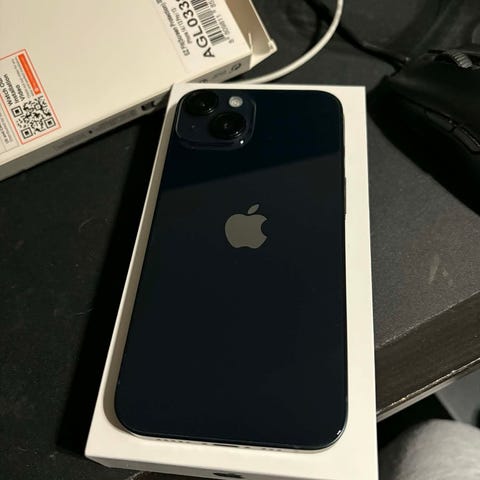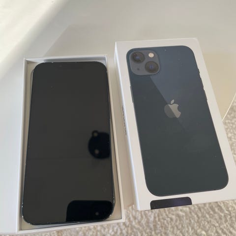 Apple iPhone 13 Mini med 256 GB lagringsutrymme. Skärmen framtill har en spricka (se bild). Batterihälsa 81%.
