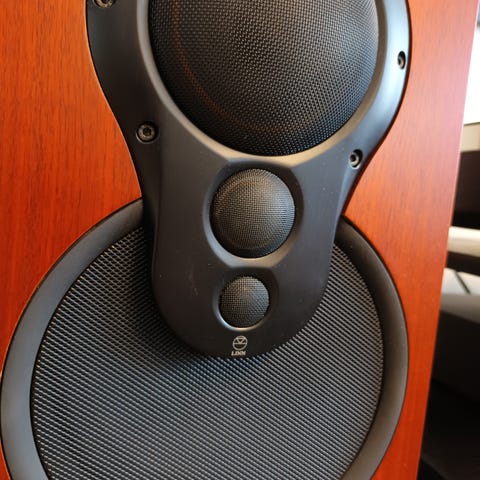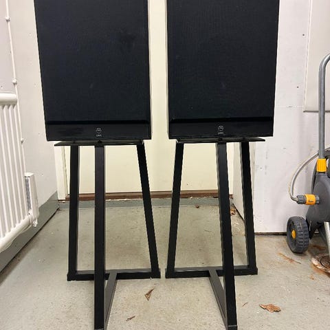 Stativhögtalare från Linn. Några få repor på stativen och ”kanttejpen” på baksida har lossnat lite men annars väldigt fina inget som påverkar det fina ljudet i dem.