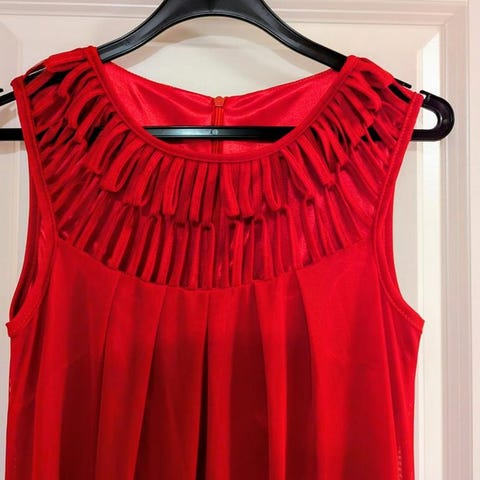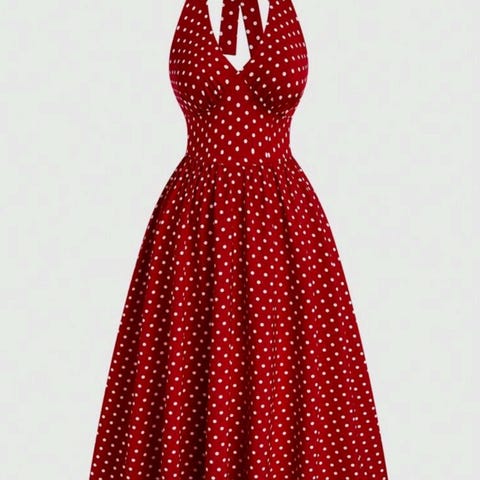Röd klänning med vita prickar, ärmlös och med fyrkantig halsringning. Klänningen har en markerad midja och en utsvängd kjol.