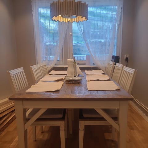 Väldigt fin matsalgrupp för 8 personer i retrostil. Matta ingår. Och även lampa med glas för beloppet.