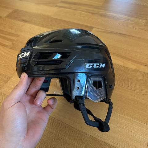 CCM hockeyhjälm med galler i vit färg. Hjälmen har justerbara remmar och skyddande galler framtill. Utrustad med certifieringsmärkning enligt HECC/ASTM-standard. Passar för ishockey och liknande is- eller rinkidrotter där huvud- och ansiktsskydd krävs.