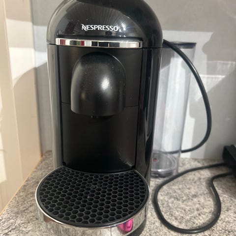 Nespresso espressomaskin med tillhörande elektrisk mjölkskummare i svart utförande. Maskinen använder kapslar och är avsedd för tillredning av espresso och andra kaffedrycker. Droppgaller och avställningsyta för kopp finns framtill. Mjölkskummaren är fristående men placerad på samma bricka som maskinen och används för att värma och skumma mjölk.