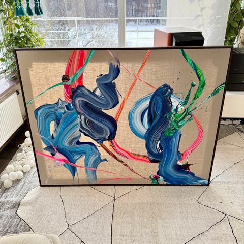 Abstrakt tavla med motiv av cirklar och linjer i blått, rött och orange mot ljus bakgrund. Tavlan är inramad i en ljus träram med glas. Passar som väggdekoration i till exempel vardagsrum, hall eller sovrum. Mått 70 x 100