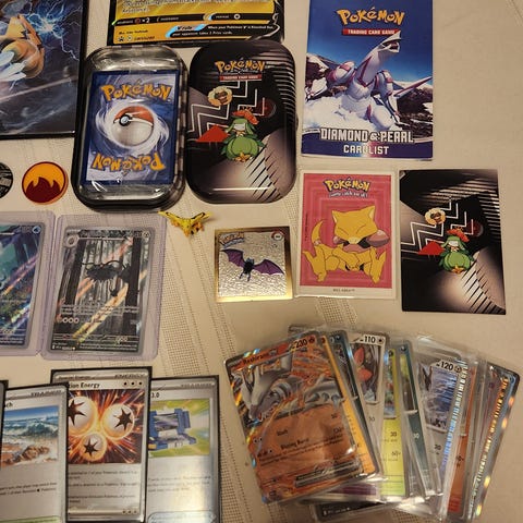 Stor mix av pokemonkort och andra samlarföremål, inklusive ett oöppnad booster pack.