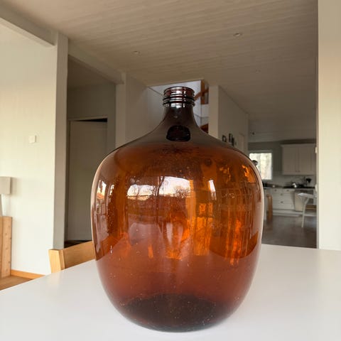 Objektet på bilden är en damejeanne, en stor, ballongformad glasflaska som traditionellt används för att brygga vin eller öl. För att skydda det ömtåliga glaset och underlätta hanteringen är den ofta placerad i en träställning eller korg med metallband.