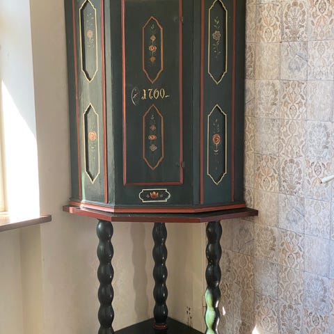 Hörnskåp vitrinskåp i brunt trä. Övre delen har glasdörr med spröjs och flera hyllplan för förvaring eller exponering av glas, porslin eller prydnader. Nedre delen har en trädörr med extra förvaringsutrymme. Skåpet är utformat för att stå i ett hörn och utnyttjar därmed ytan effektivt i vardagsrum, matsal eller kök. Sidorna ca 53 cm ut från hörn, bredd 75 cm, höjd 175 cm 😊