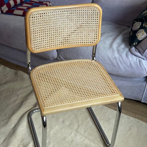 Säljer fyra stilrena stolar med rotting/cane i sits och rygg samt kromade medar.