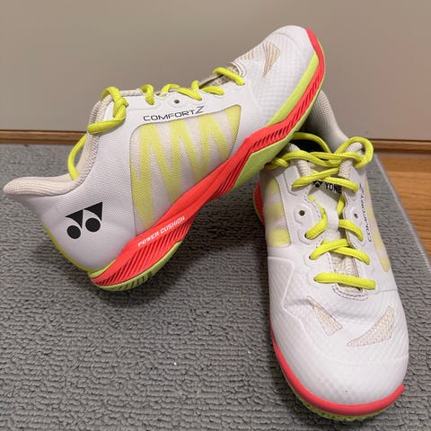 Yonex badmintonracket med tillhörande fodral. Racketet har strängat huvud och grepp med lindat handtag.