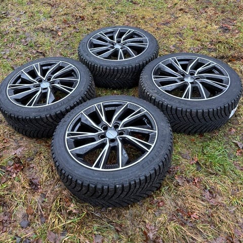 Audi 20 tum fälgar i aluminium i silverfärg. Fälgarna har ett flerspoksutförande och levereras med Audi-navkapslar enligt bild. Passar som sommar- eller vinterhjul beroende på val av däck. Exakta mått, bultcirkel och ET-värde bör kontrolleras mot aktuell bilmodell innan montering.