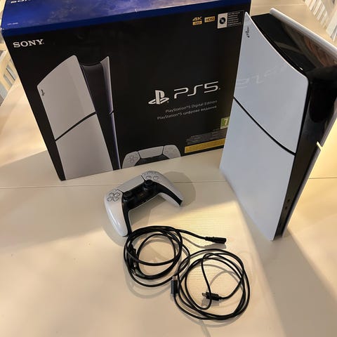 Sony Playstation 5 spelkonsol i vit färg. På bilderna syns två trådlösa handkontroller (DualSense) i vit färg samt kablar. Lämplig för användning med kompatibla PS5-spel och tillbehör.