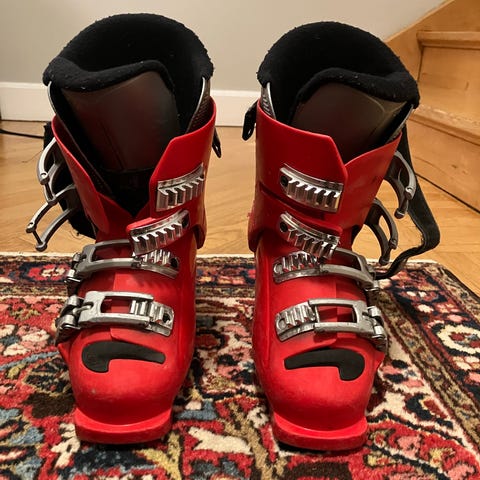 Salomon Performa T4 pjäxor i storlek 22.0 (EU ca 35, UK 2,5, US 3). Färg röd med svarta detaljer. Modellen har fyra justerbara spännen i metall och vadderat skaft för stöd och komfort. Passar för alpin skidåkning, troligen för barn eller juniorer baserat på storleken. Ytterskal i hårdplast och innersko i textil/foam-material.