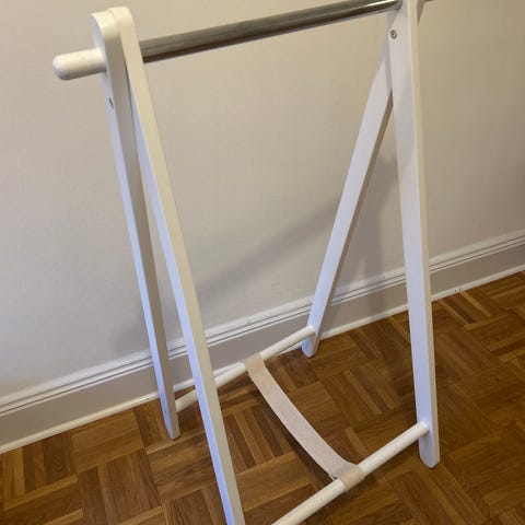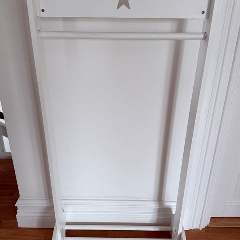 Jollyroom klädställning för barn i A‑form. Ställningen har en vit klädstång upptill för galgar och en underhylla i träfärg för förvaring av skor, lådor eller leksaker. Passar i barnrum för upphängning av kläder, utklädningskläder eller ytterplagg. Fristående modell som placeras direkt på golvet.
