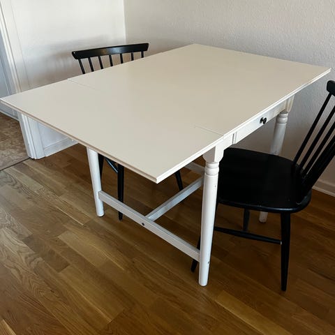 Fällbart bord med bordsskiva i bambu och vita metallben. Några fläckar på bordsskivan, se bilder.