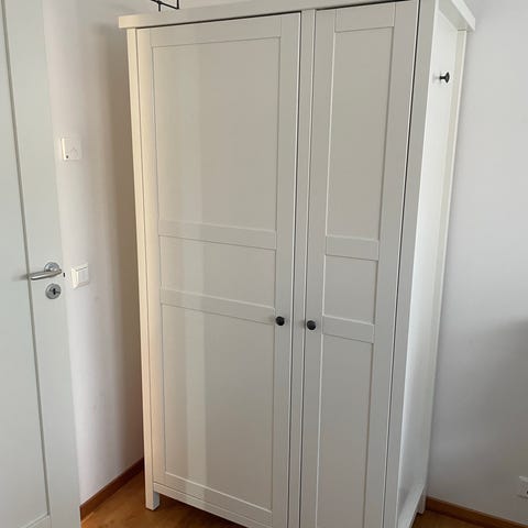 Liten garderob i okej skick, finns lite repor (se bild på dörren och längs sidan). Men annars inga konstigheter! Finns en stång högst upp, ett hyllplan i mitten samt 5 trådbackar