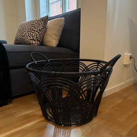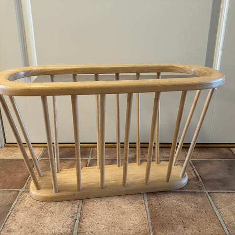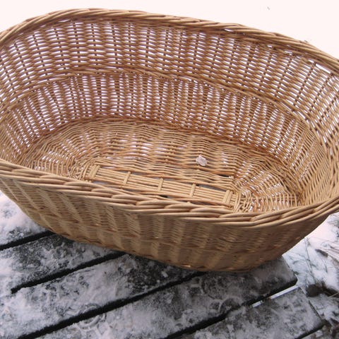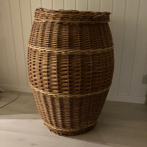 Stor äldre tvättkorg/mangelkorg i rotting. Oval form med flätad konstruktion och handtag i ändarna. Passar för förvaring av till exempel filtar, leksaker.