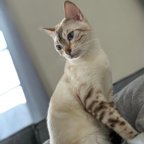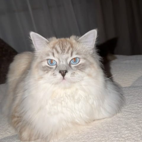 Han är en mycket kelig, gosig och trygg katt med fantastiska himmelsblå ögon och lång, mjuk päls. Väldigt charmig och omtyckt, med fin och tydlig färgteckning.
