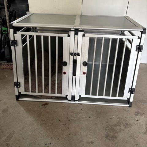 Hundbur dubbel för transport av hund i bil. Tillverkad i aluminium med svarta väggar och vita ribbor/ramar. Buren har två separata dörrar framtill med galler för ventilation. Sned bak- och framkant är anpassad för bilens bagageutrymme.