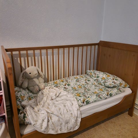 IKEA spjälsäng i trä i naturfärg. Klassisk spjälsäng med ribbor runtom och möjlighet att ta bort ena långsidan för enklare i- och urstigning. Passar som säng till små barn och kan placeras mot vägg eller fritt i rummet. Har en öppning för barnet själv ska kunna gå in och ut. Madrass och lite sängkläder kan medföljas om så önskas.