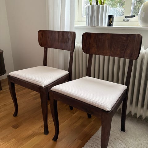 Matstol med vadderad sits och ryggstöd med klassisk beige tygklädsel. Stolen har en avtagbar offwhite teddyklädsel så att du enkelt kan ändra stolens utseende. Ben i stål med eklook.