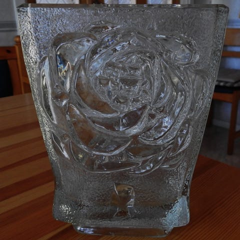 Vas från okänd tillverkare i vit färg med blommotiv på framsidan. Formen är rektangulär med mjukt rundade hörn och veckad öppning upptill. Passar för snittblommor eller som dekorativ inredningsdetalj.