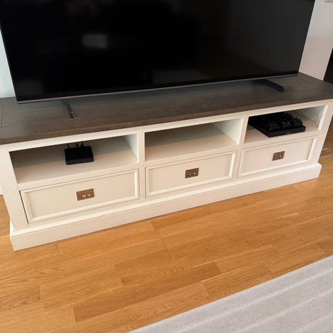 Blank tv-bänk köpt från Mio med gott om förvaring. Har inga som helst skador, dock sitter någon av dörrarna lite snett men det är enkelt att justera med skruvmejsel eller liknande.