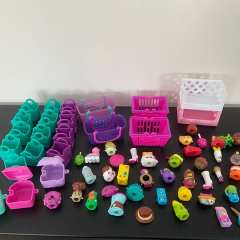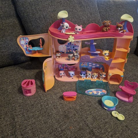 Pet Shop lekset med flera djurfigurer och mindre dockor samt olika lekset och tillbehör. Innehåller bland annat plastfigurer i olika färger och former, lekbyggnader, fordon och möbler i plast samt många små accessoarer som kläder, väskor och andra delar.