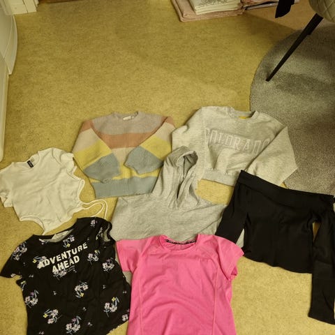 2 långa linnen/klänningar, en stickad klänning, 1 par shorts, en hoodie velour, 2 korta linnen, 1 oanvänd t shirt, 3 par tights, 3 par trekvarts tights.