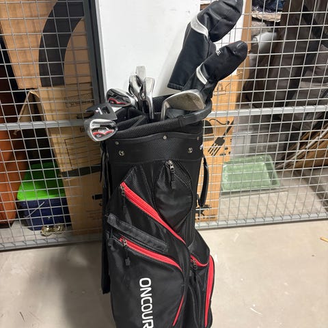 Golfset med bag och golfvagn röd och gul