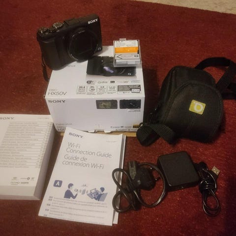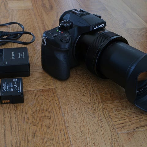 Canon PowerShot G3 X digitalkamera Kompakt bridgekamera med fast zoomobjektiv och utfällbar skärm. Kameran har inbyggd blixt, flera manuella inställningsmöjligheter via rattar och knappar på ovansidan samt bärrem fäst på kamerahuset. På bilderna syns även objektivlock, batteriladdare och kabel som tillbehör. Lämplig för både stillbildsfotografering och videoinspelning i olika situationer.