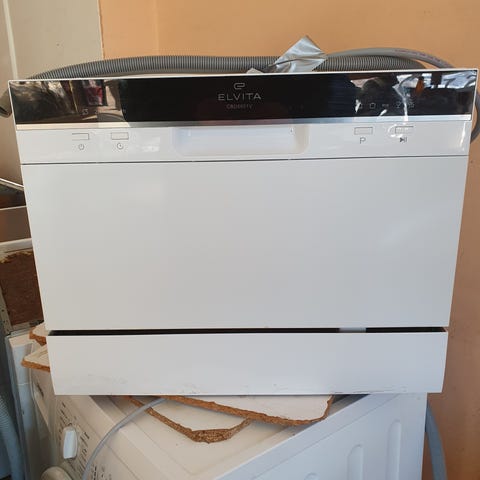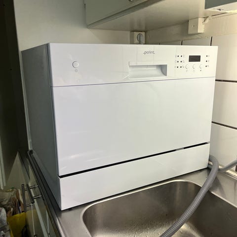 Scandomestic bänkdiskmaskin i kompakt modell. Fristående diskmaskin som placeras på bänk, lämplig för mindre kök, kontor eller fritidsboende. Maskinen har frontlucka med glasruta och invändig korg för tallrikar, glas och bestick. Panel med knappar på framsidan för val av diskprogram. Ansluts till vatten och avlopp enligt tillverkarens anvisningar men kan också användas om man inte ansluter den.
