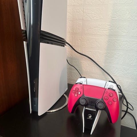 Sony Playstation 5 spelkonsol i vit färg. Konsolen har anslutningar på baksidan för HDMI, nätverk och USB. En trådlös handkontroll (DualSense) i svart färg ingår enligt bilderna. Lämplig för spel, streaming och underhållning med stöd för moderna spel och tjänster på Playstation-plattformen