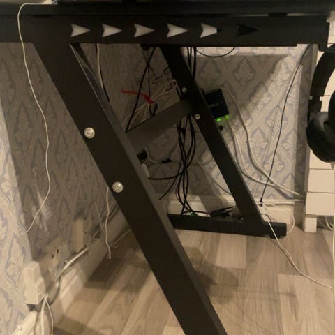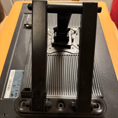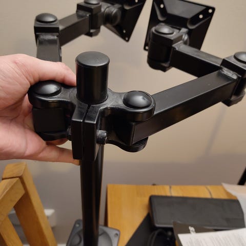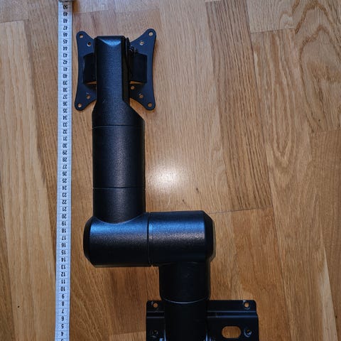 Monitorstativ med VESA-fäste i svart metall. Stativet har tre ben och en fyrkantig monteringsplatta med flera skruvhål för justering av skärmens position. Avsett för montering av datorskärm eller liknande utrustning som använder VESA-kompatibelt fäste. Passar som fristående skärmstativ på golv eller annan plan yta i hem- eller kontorsmiljö.