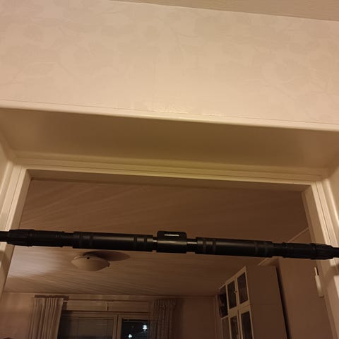 Pullup-stång i svart färg. Monteras i dörrkarm utan fasta skruvar. Utrustad med flera greppytor med vadderade handtag för olika typer av pull ups och chin ups. Passar för hemmaträning av överkropp, till exempel rygg, armar och axlar. Kan enkelt tas ned och förvaras när den inte används.