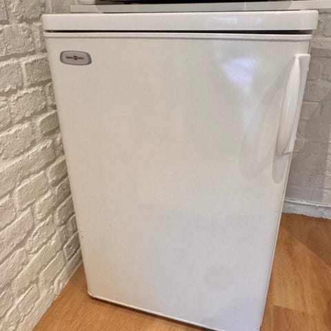 Elektro Helios kylskåp i vitt utförande. Fristående modell med en dörr. Invändigt finns trådhylla och förvaringsfack i dörren. Baksidan har synlig kylslinga och kompressor. Passar för användning i kök, förråd eller som extra kyl för mat och dryck. Yttre märken och slitage förekommer enligt bilder.