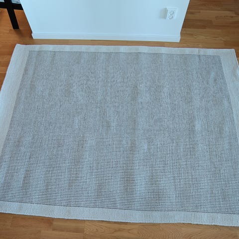 Mio matta i gråmelerad ull med och brun kant i skinn. Rektangulär modell som passar under matbord eller i vardagsrum. Neutrala färger som fungerar i många typer av inredningar.