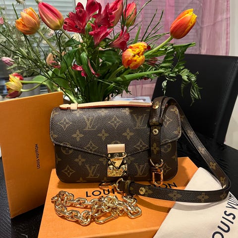 Louis Vuitton axelremsväska för kvinna i läder. Väskan har ett brunt yttertyg med klassiskt monogrammönster och en axelrem med kedjedetaljer. Modellen bärs över axeln eller crossbody och passar för vardag och festliga tillfällen. Inredningen är röd och rymlig. Säljs med tillhörande Louis Vuitton-förpackning enligt bild.