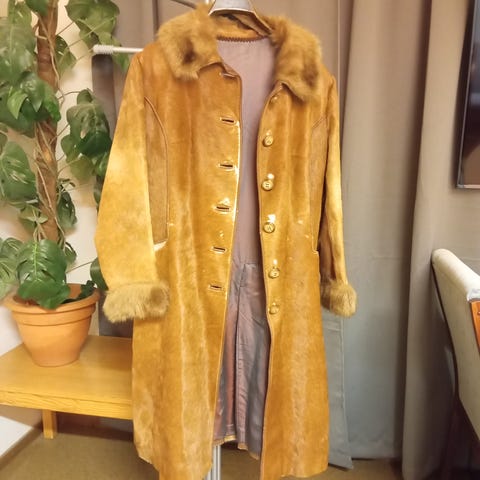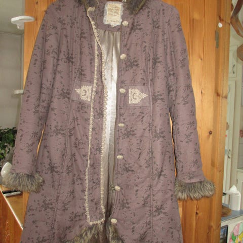 Beige mockaimitation och kantad med fuskpäls och vackra broderier runtom.