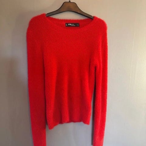Vinröd, mjuk tröja. Bouclétextur.