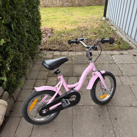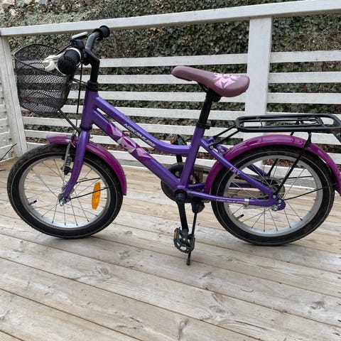 Barncykel med 16" hjul i lila färg. Utrustad med pakethållare bak, skärmar, kedjeskydd, stöd och reflexer. Passar yngre barn som behöver en mindre cykel med fotbroms och handbroms fram. Sadeln har mönster och styret är rakt med handtag anpassade för barn.
