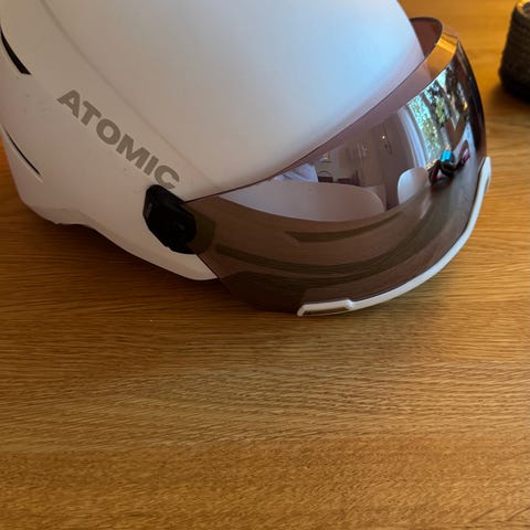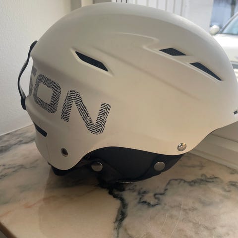 Bliz Nova skidglasögon i originalförpackning tillsammans med vit skid- eller snowboardhjälm. Hjälmen har slät ytfinish och ventilationshål upptill. Skidglasögonen är av typen Nova med ram som passar de flesta hjälmar och har lins anpassad för skid- och snowboardåkning. Utrustningen lämpar sig för användning i skidbacke och annan vintersport där huvudskydd och ögonskydd behövs.