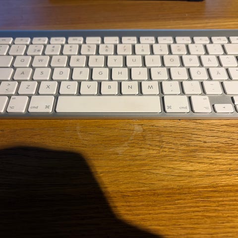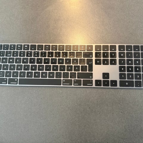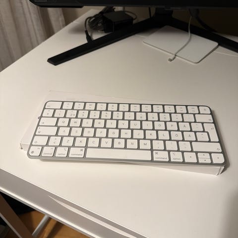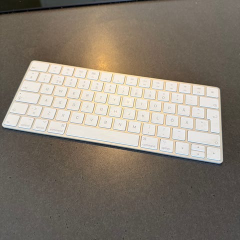 Säljer ett original Apple Magic Keyboard i vitt, batteridrivet med strömbrytare på sidan.
