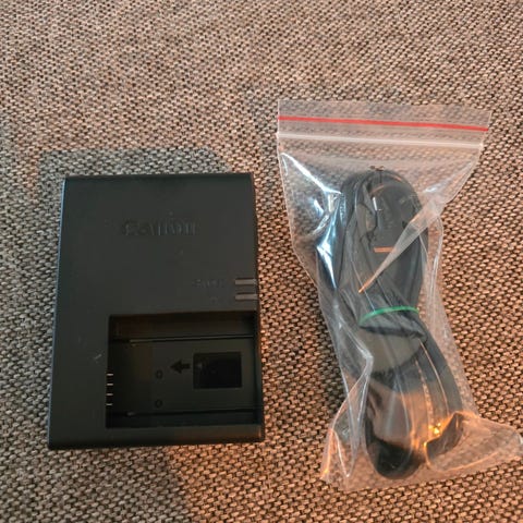 Canon PowerShot G10 kompaktkamera i svart. Digitalkamera med inbyggd zoomoptik och manuell kontroll via rattar och reglage på ovansidan. På bilderna syns kamerahus, två Canon-batterier, Canon-batteriladdare med nätkabel samt passande kameraväska/fodral i läder eller läderimitation. Lämplig som kompakt systemliknande kamera för allmän fotografering, resor och vardagsbilder.