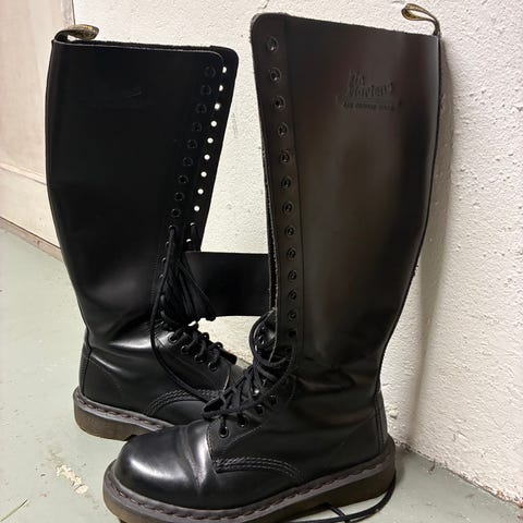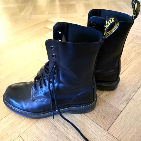 Höga Martens med dragkedja för att enkelt ta av och på. 14 hål och det klassiska mjuka skinnet. Som nya, se bild på sulan. Nypris 2400kr. Säljes för 700kr.